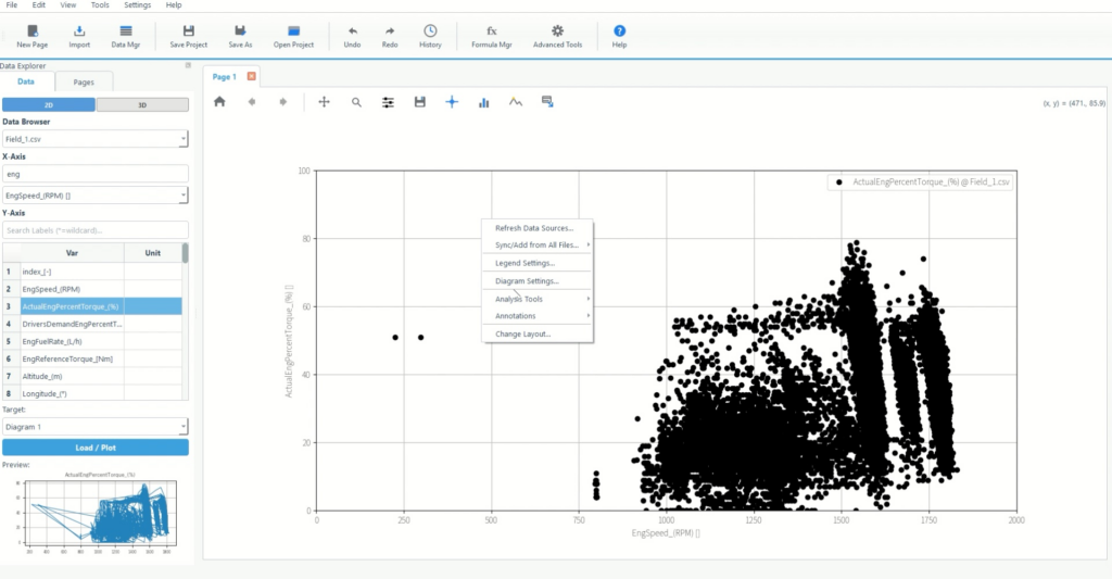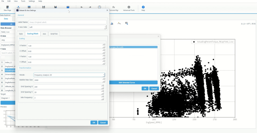ある項目に対して、別の項目が「どの値の組み合わせで多く発生しているか」を把握したい場面があります。たとえば回転数とトルクのように、動作状態を表す2つの値を並べると、滞在しやすい領域(発生しやすい領域)が見えてきます。EchartのFrequency Analysis 2Dを使うと、値の組み合わせごとの件数を集計し、バブルの大きさで頻度を視覚化できます。この記事では、頻度バブルチャートを作成する手順と、設定の考え方をまとめます。