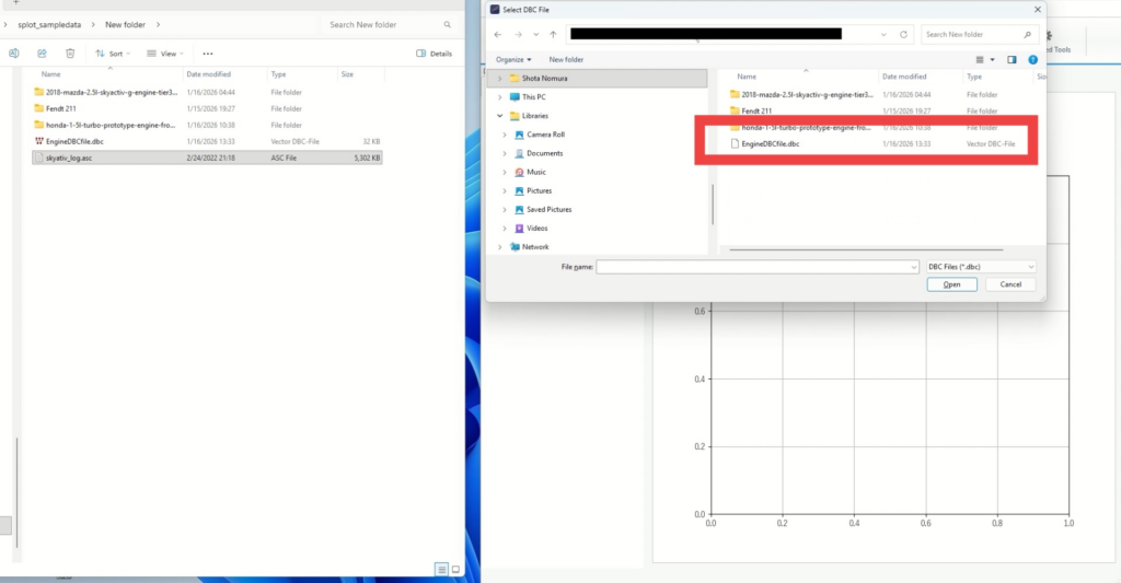 - DBCの選択画面(Select DBC File)が表示されたら、対象のDBCを選びます